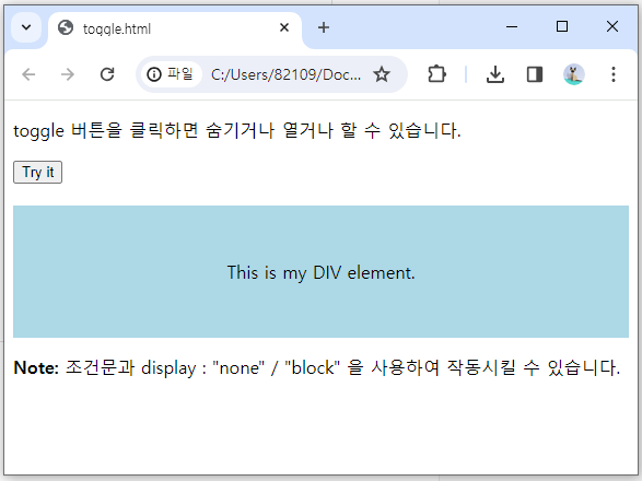 이어 다시 클릭하면 현재상태가 display:block 이므로 거짓(False)이므로 else 실행문을 작동합니다. 즉 display:none 으로 바뀌고 화면은 숨겨지게 됩니다.