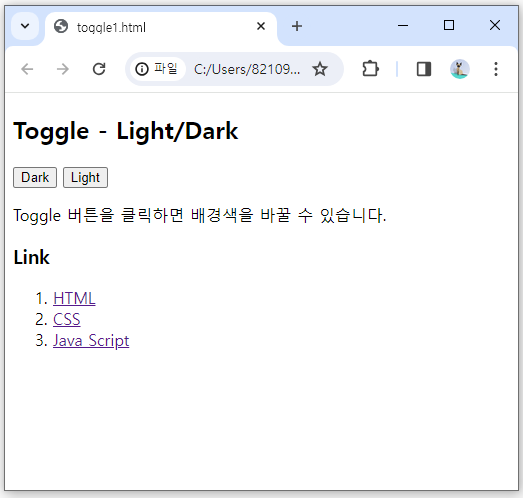 <p> toggle 버튼을 클릭하면 배경색을 바꿀 수 있습니다.</p>