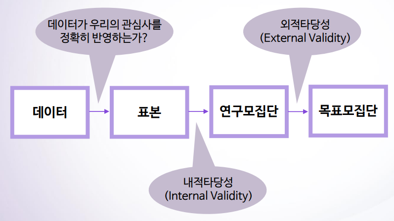 연구모집단과 목적모집단이 일치한다면 문제가 없지만, 연구모집단과 목적모집단이 정확히 일치하지 않을 경우 연구모집단의 결과를 목적모집단으로 확장할 수 있는 경우가 있습니다. 이렇게 확장할 수 있는 경우에 외적타당성을 가지고 있다고 합니다.