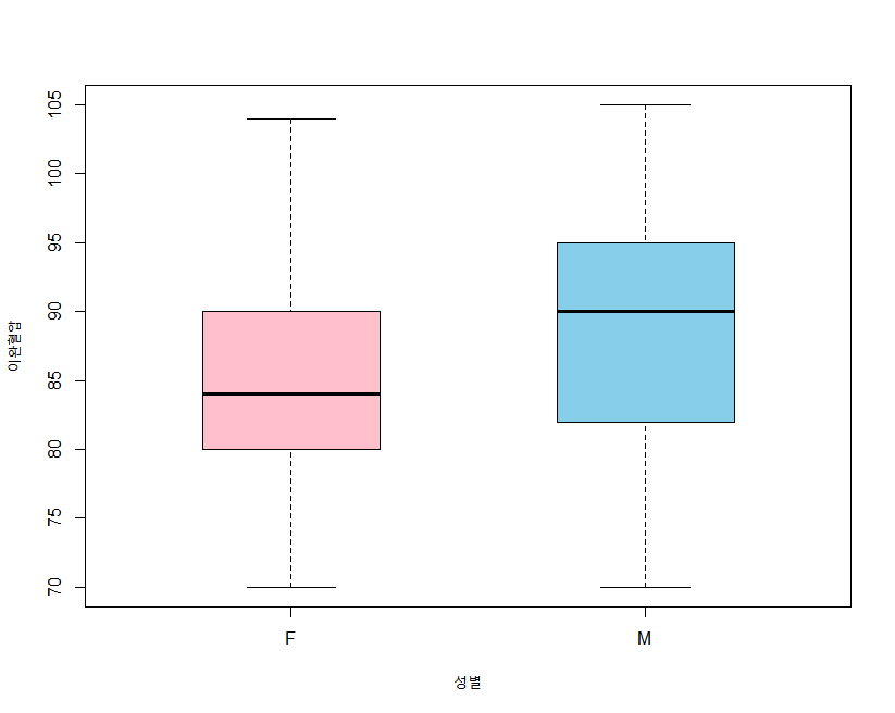 boxplot(이완혈압~성별,health, col=c("pink","skyblue"),boxwex=0.5)