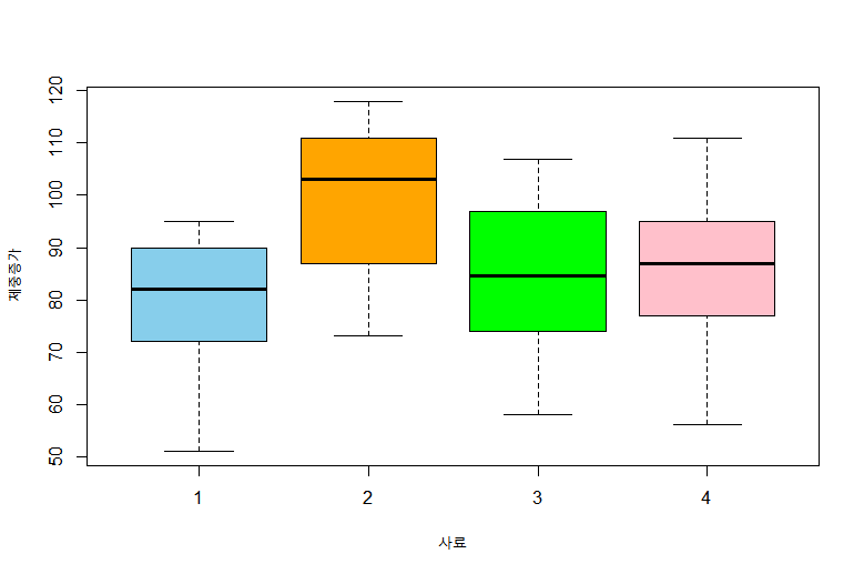 boxplot(체중증가~사료,rats, col=c("skyblue",'orange','green','pink'))