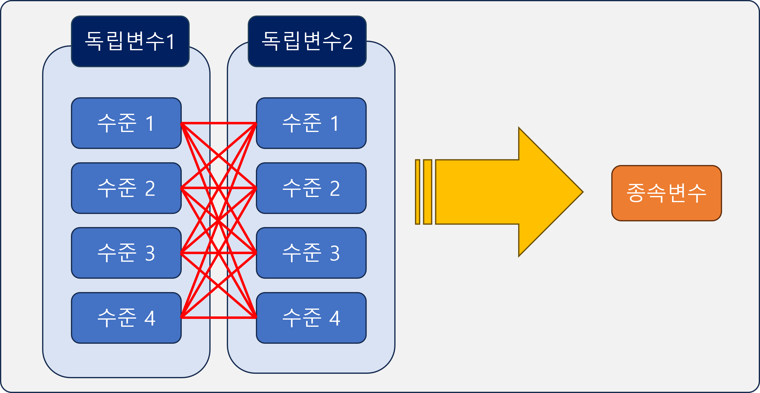 이원배치 분산분석은 두 개의 설명(독립)변수(요인)가 있는 경우에 적용됩니다. 이 요인들의 각 수준 조합에 대한 종속변수의 평균 차이를 비교합니다.