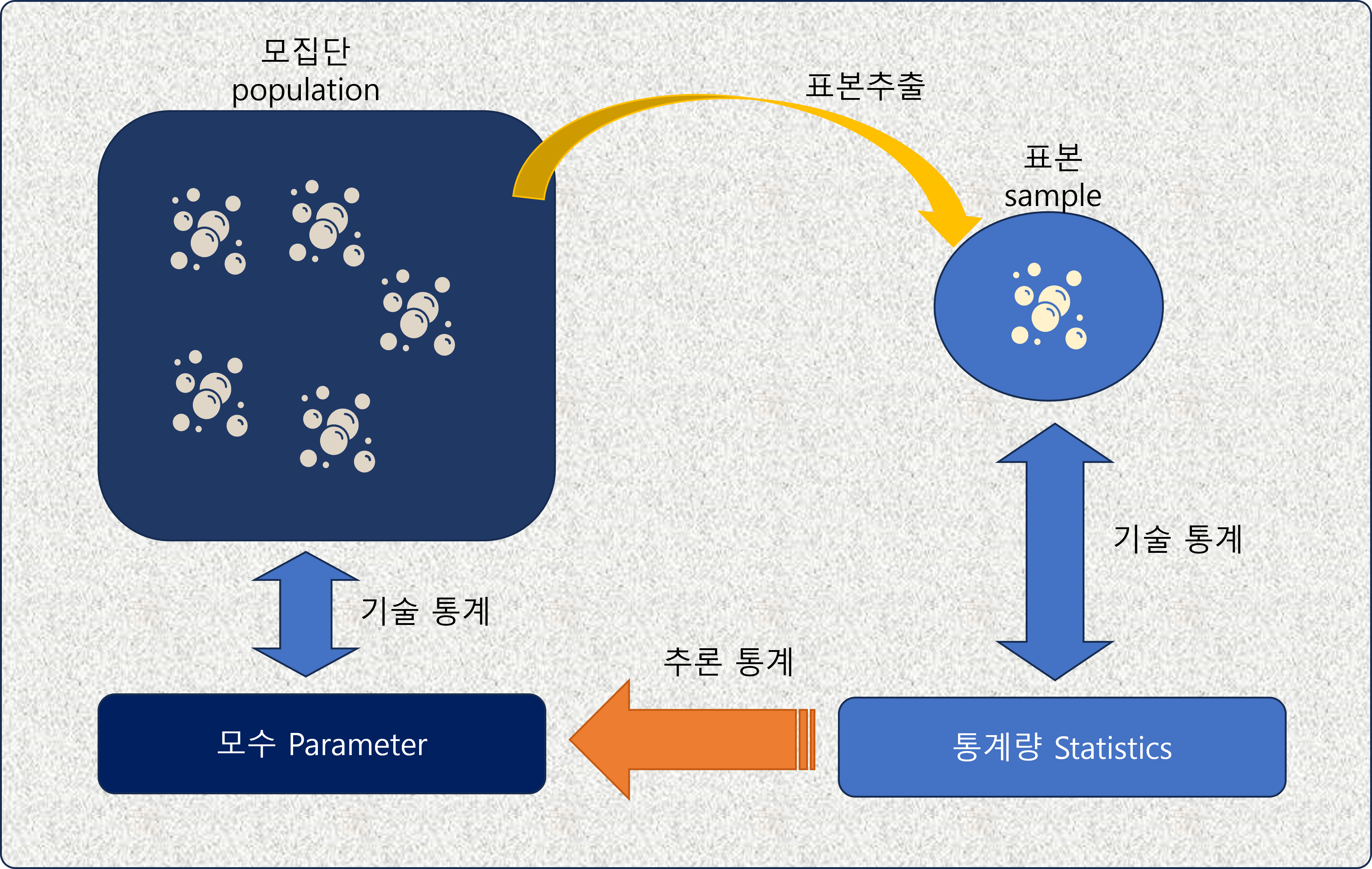 모집단과 표본 그리고 기술통계와 추론통계 간의 관계는 아래와 같이 표현할 수 있다.