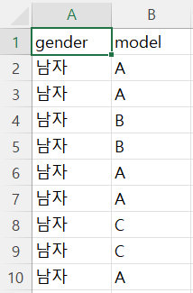 결과를 살펴보면 남자 중 모델 A는 35, B는 23, C는 18명이 선택하고 여자 중 A는 17명, B는 33명, C는 20명이 선택하였습니다.