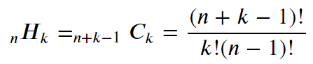 중복조합은 복원추출이며 순서를 고려하지 않습니다. 구하는 산식은 아래와 같습니다.