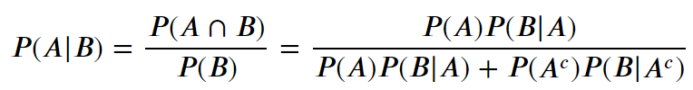 질문인 양성반응이 나왔을 때 암에 걸렸을 확률은 P(A| B) 로 나타낼 수 있습니다. 이것은 베이즈 정리를 사용하여 얻을 수 있습니다.