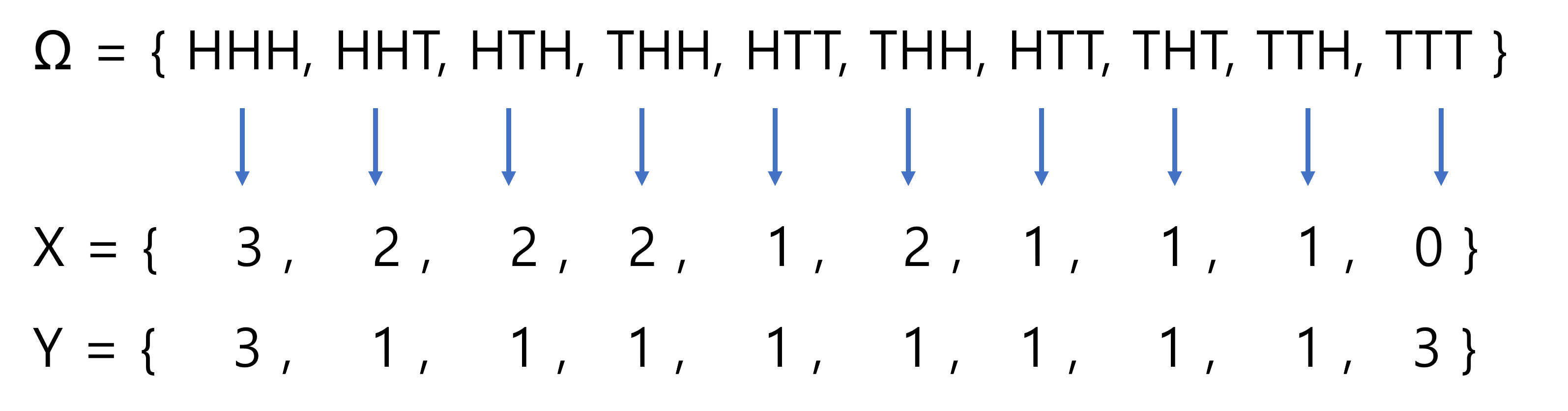 동전을 3개 던지는 확률실험을 할 때, 표본공간은 총 8개 입니다.
