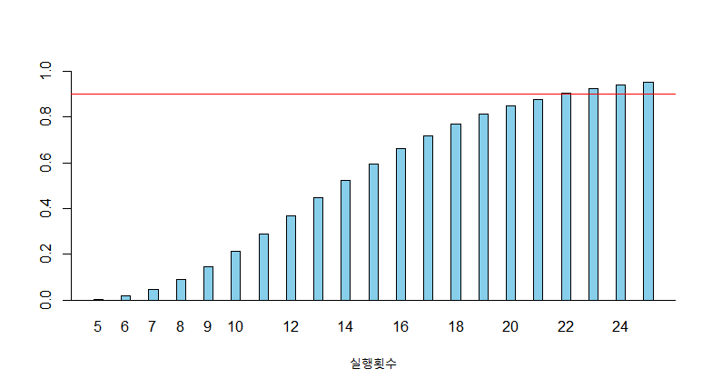 위 그래프에서 90% 이상의 성공률을 보이는 최소 실행 횟수는 4 회임을 알 수 있습니다.