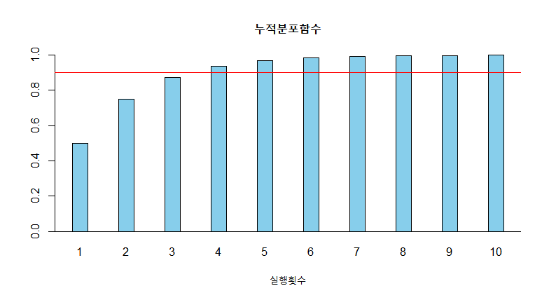 barplot(pge, space = 2, col='skyblue',main='누적분포함수', xlab = '실행횟수',ylim =c(0,1))