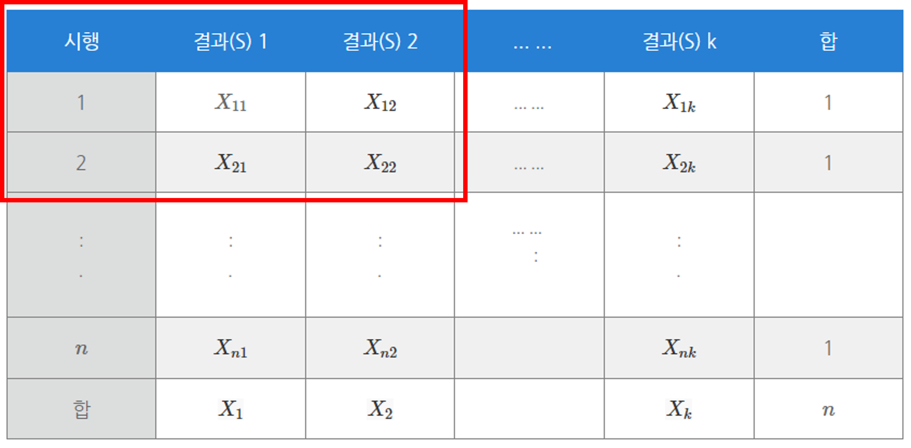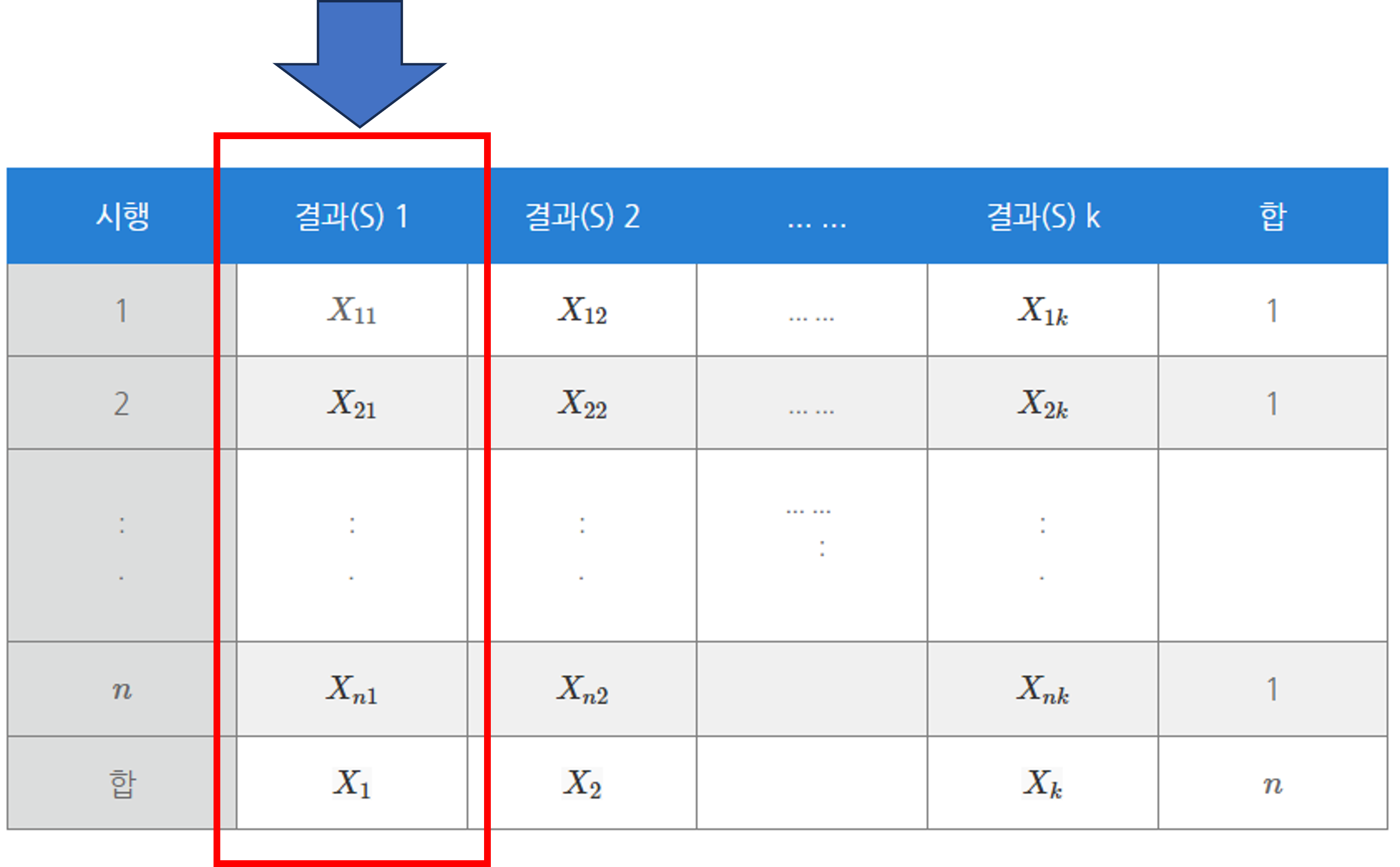 | 시행 | 결과(S) 1 | 결과(S) 2 | ... ... | 결과(S) k | 합 |