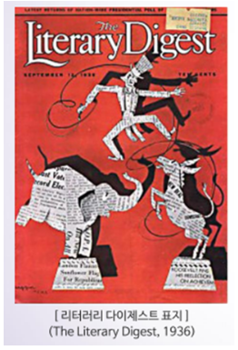 Literary Digest 라는 잡지는 1916 ~ 1932년의 대통령 선거 결과를 정확하게 예측한 경험이 있었다고 합니다. 이 회사는 그 당시 규모도 크고 이 잡지의 구독자, 전화기 및 자동차 보유자 236만 여명의 의견을 분석하여 나온 결과는 Landon 57%, Roosevelt 43%로 공화당의 Landon 후보의 당선을 예측하였다고 합니다.