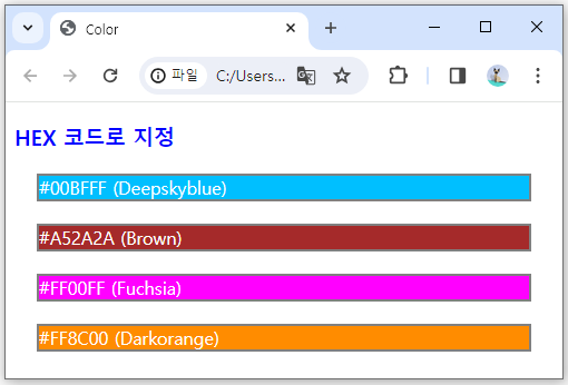 예를들어 검은색은 #000000, 흰색은 #ffffff , 빨간색은 #ff0000, 녹색은 #00ff00, 파란색은 #0000ff 등으로 표현합니다.