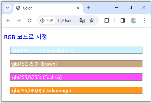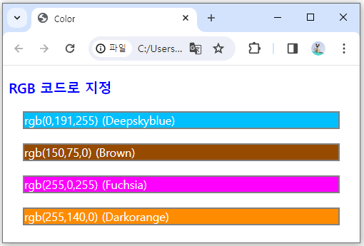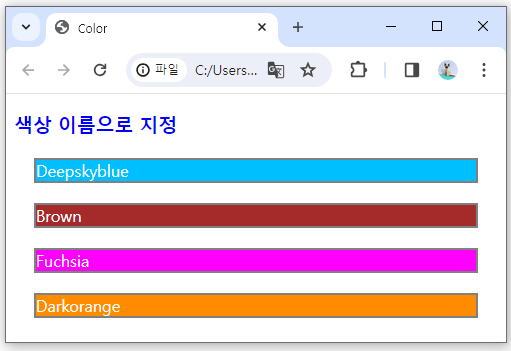 모든 브라우저는 140가지 색상 이름을 지원합니다. 색상 이름은 아래의 사이트를 참고하시기 바랍니다.