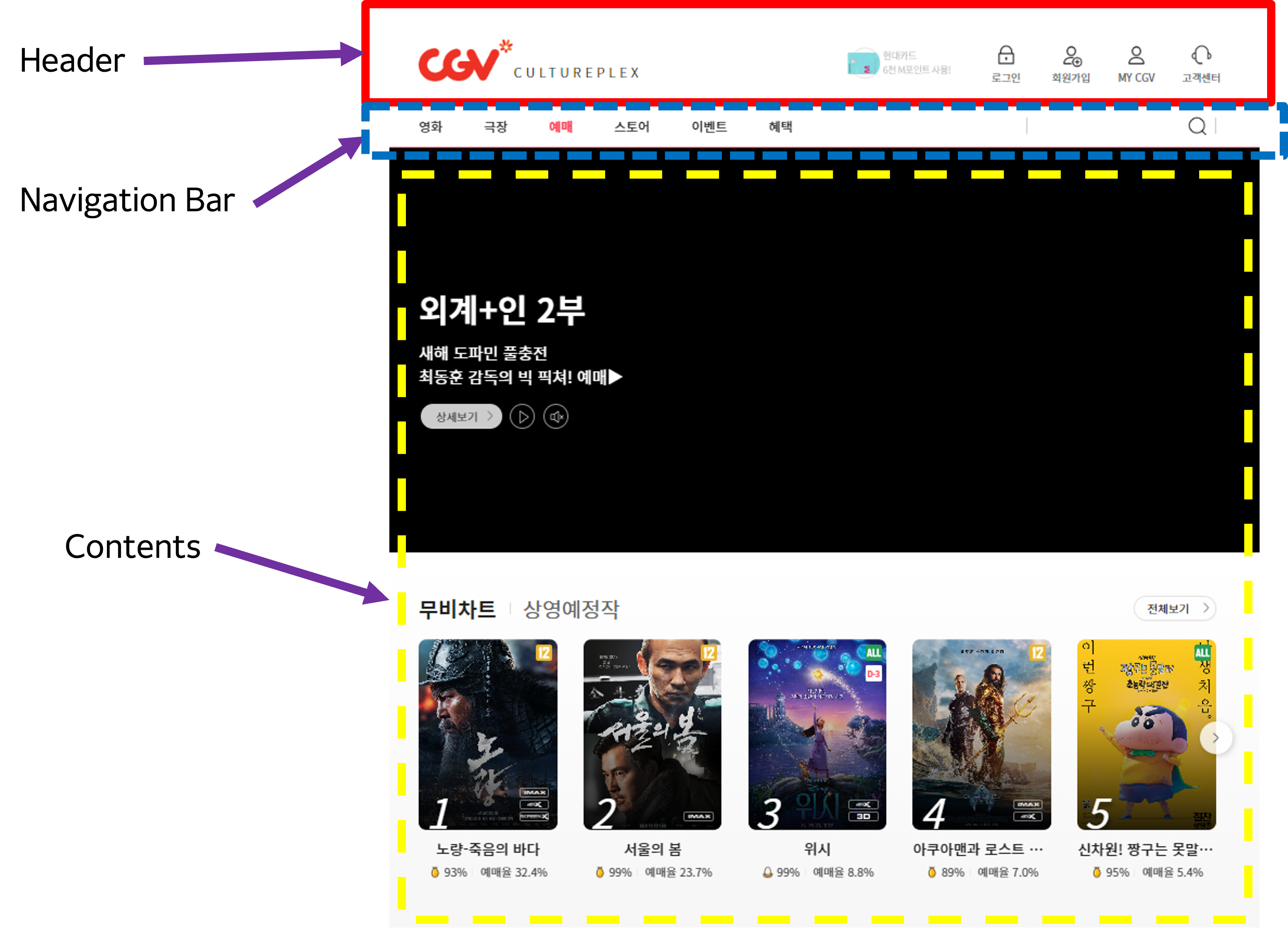 웹페이지 상단에 위치하며, 로고, 사이트 제목, 메뉴 등이 포함됩니다. 주로 사이트의 식별과 탐색을 위한 요소가 배치됩니다.