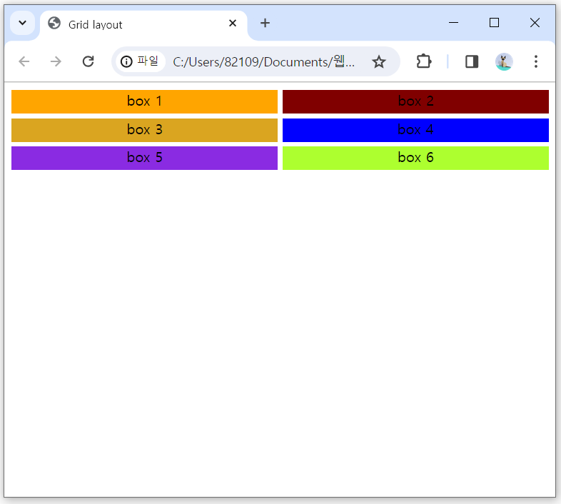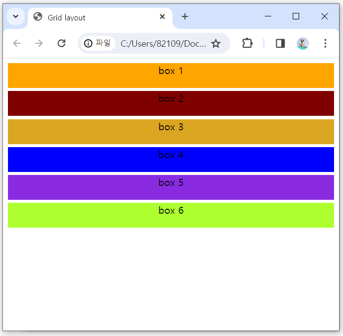 grid layout 이란 큰 틀 안에 box 6개를 만들어 어떻게 배치하는지 알아보겠습니다.