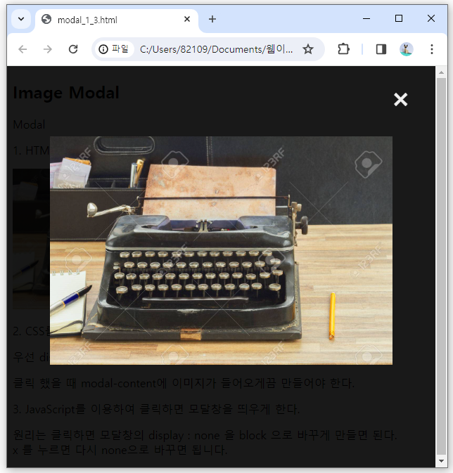 <p> 1. HTML에 이미지와 모달창을 만든다.</p>